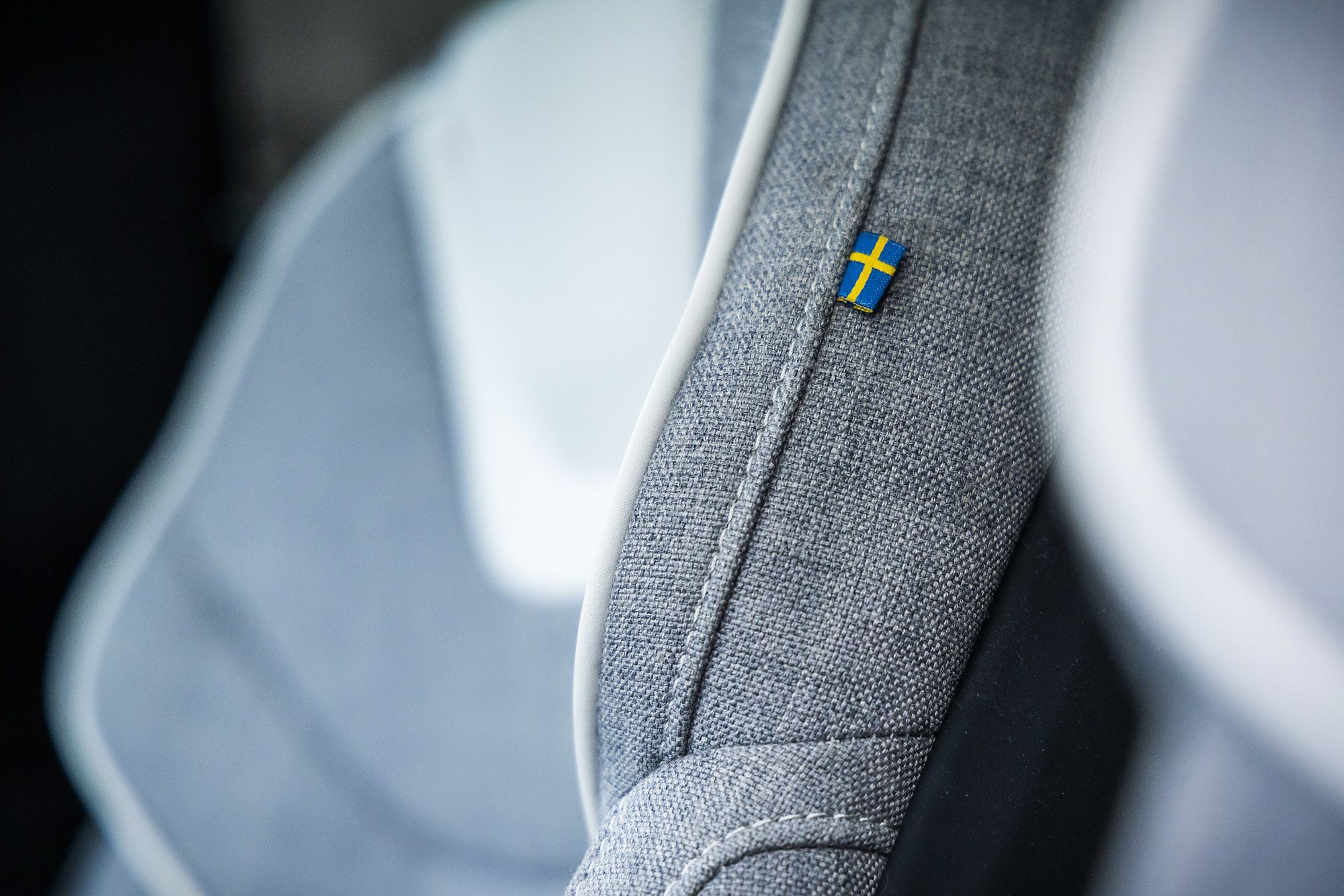 O interior segue a linha minimalista escandinava que a Volvo aperfeiçoou nos últimos anos. Os estofos em mistura de lã com a tradicional bandeira da Suécia no rebordo lateral são um toque de bom gosto. O extenso teto panorâmico fixo inunda o habitáculo de luz natural, transformando qualquer viagem numa experiência mais luminosa e acolhedora.